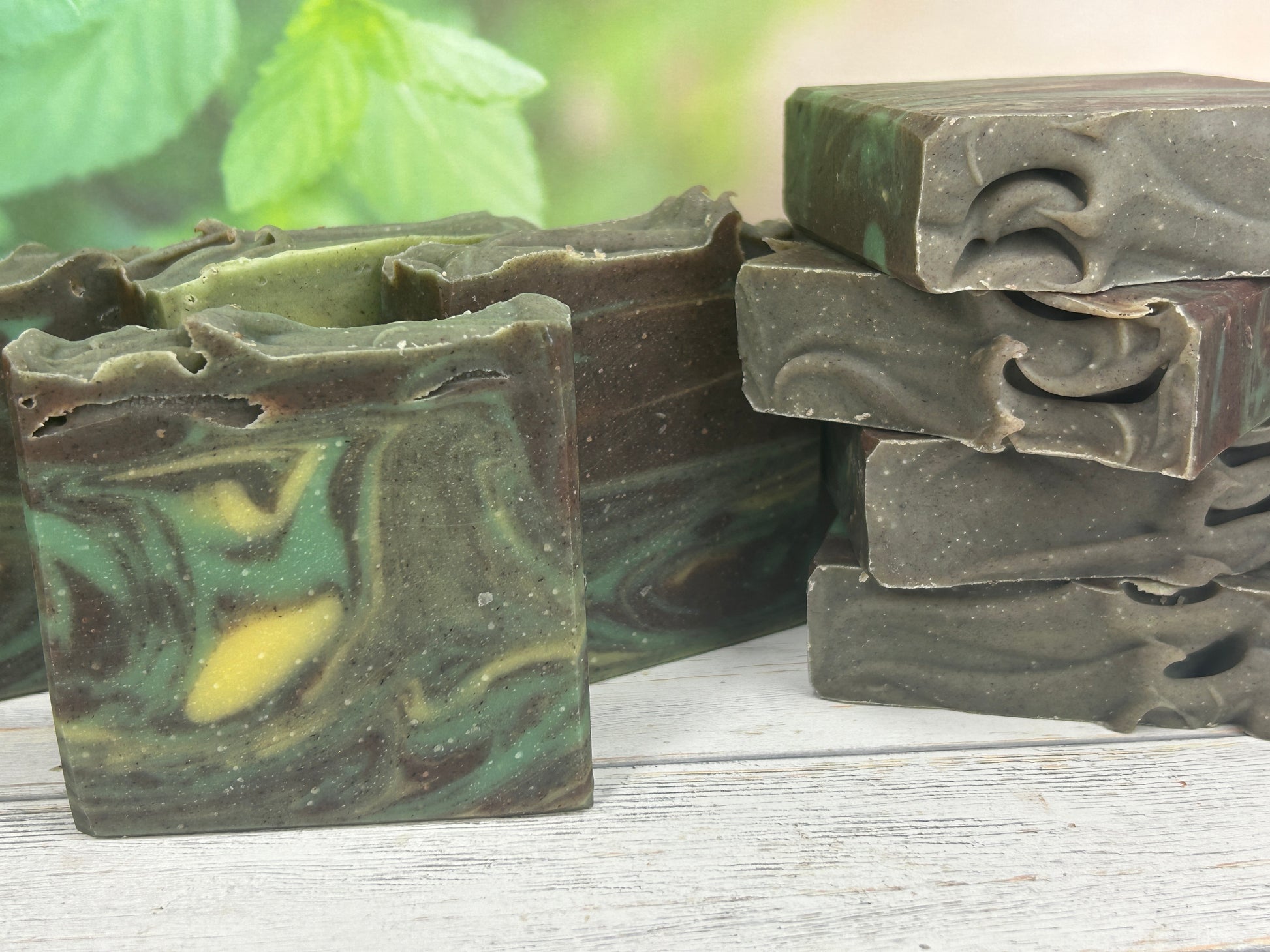 Ingredients: Saponified Olive Oil, Saponified Coconut Oil, Sodium Hydroxide, Saponified Shea Butter, Saponified cocoa Butter, Saponified Castor Oil, Aloe Vera, Colloidal oats, Tea Tree EO, Red Sandalwood Powder, Lavender EO, Amyris EO, French Green Clay, Eucalyptus Globulus EO, Copaiba Balsam EO, Titanium Dioxide, EO, Citric Acid, Tussah Silk, Fresh Green Mica, Luster Brown Mica, Dark Yellow Mica